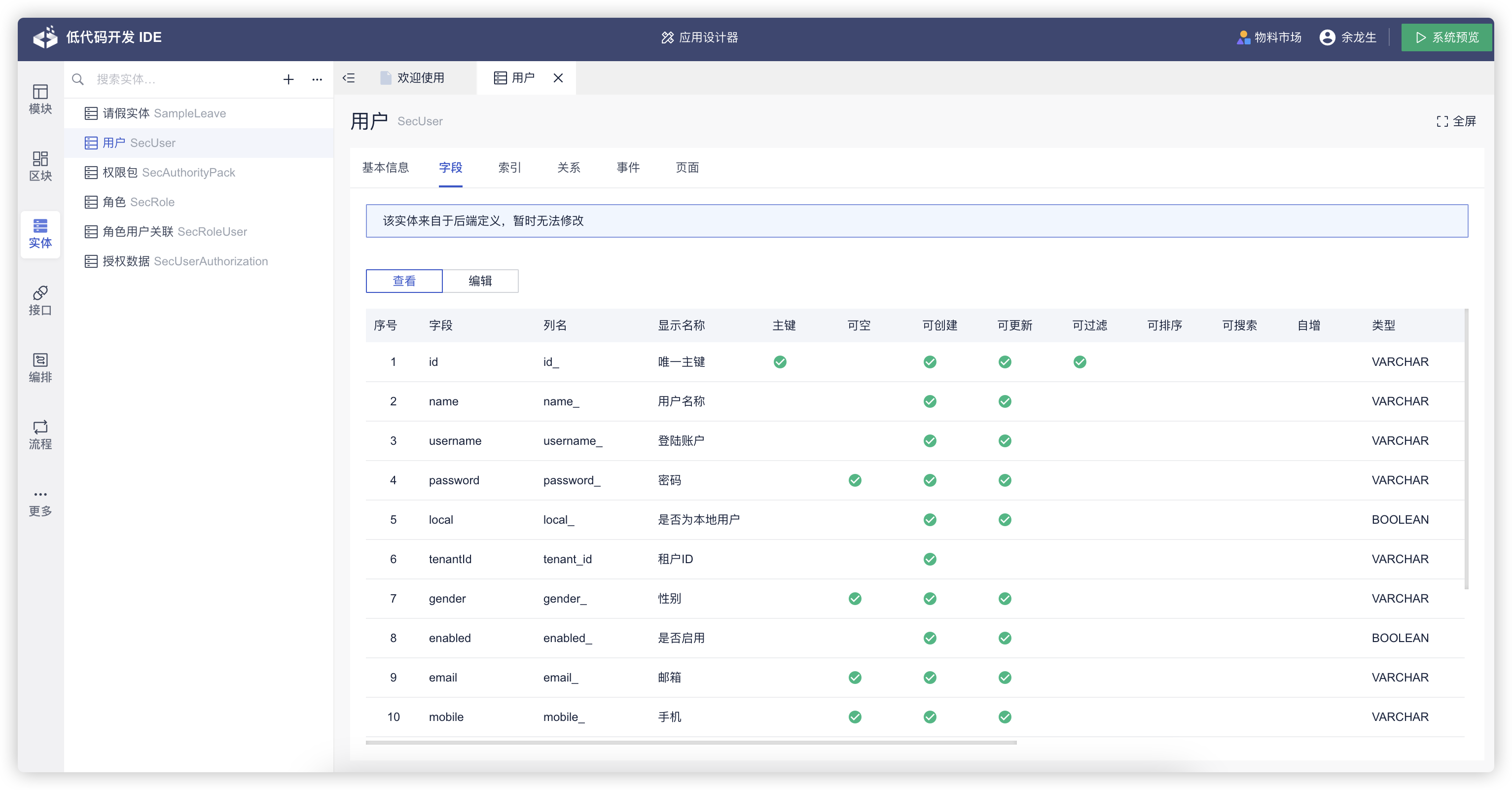 在低代码IDE中,点击 + 新建实体,之后手工配置字段,所有,关系,事件等。