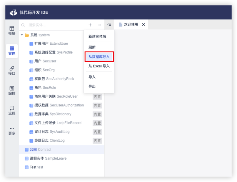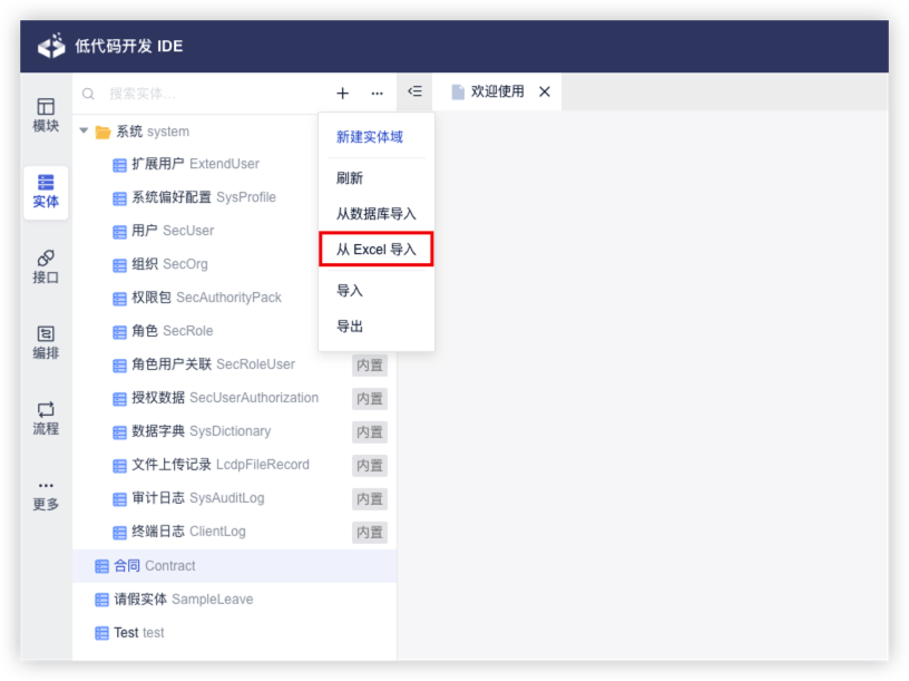 - 从Excel导入实体:通过Excel表格的方式导入实体,适合简单的实体设计场景。