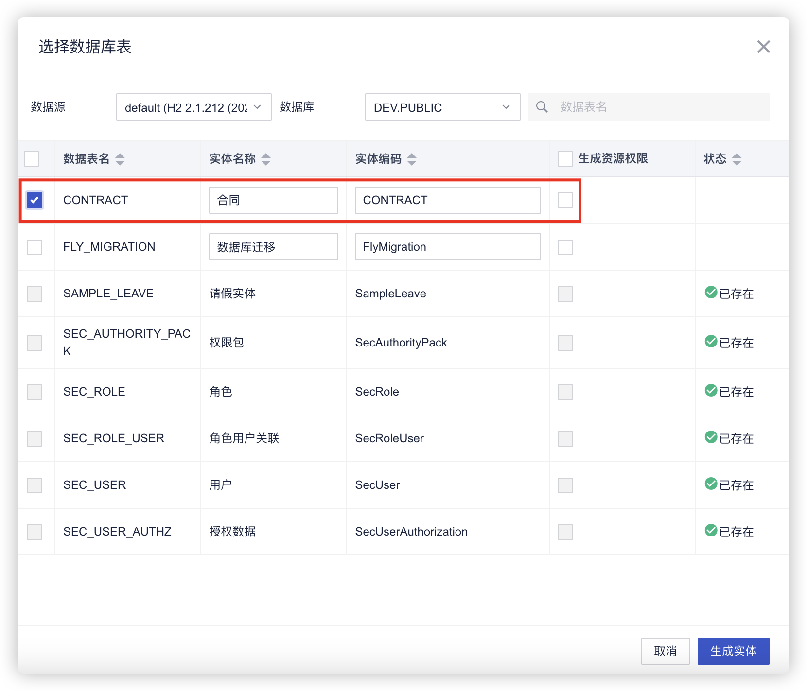 低代码平台支持多种数据源,具体可以参考应用配置,这里我们选用 H2 作为实现的示例。选择对应的数据表名,之后点击生成实体。