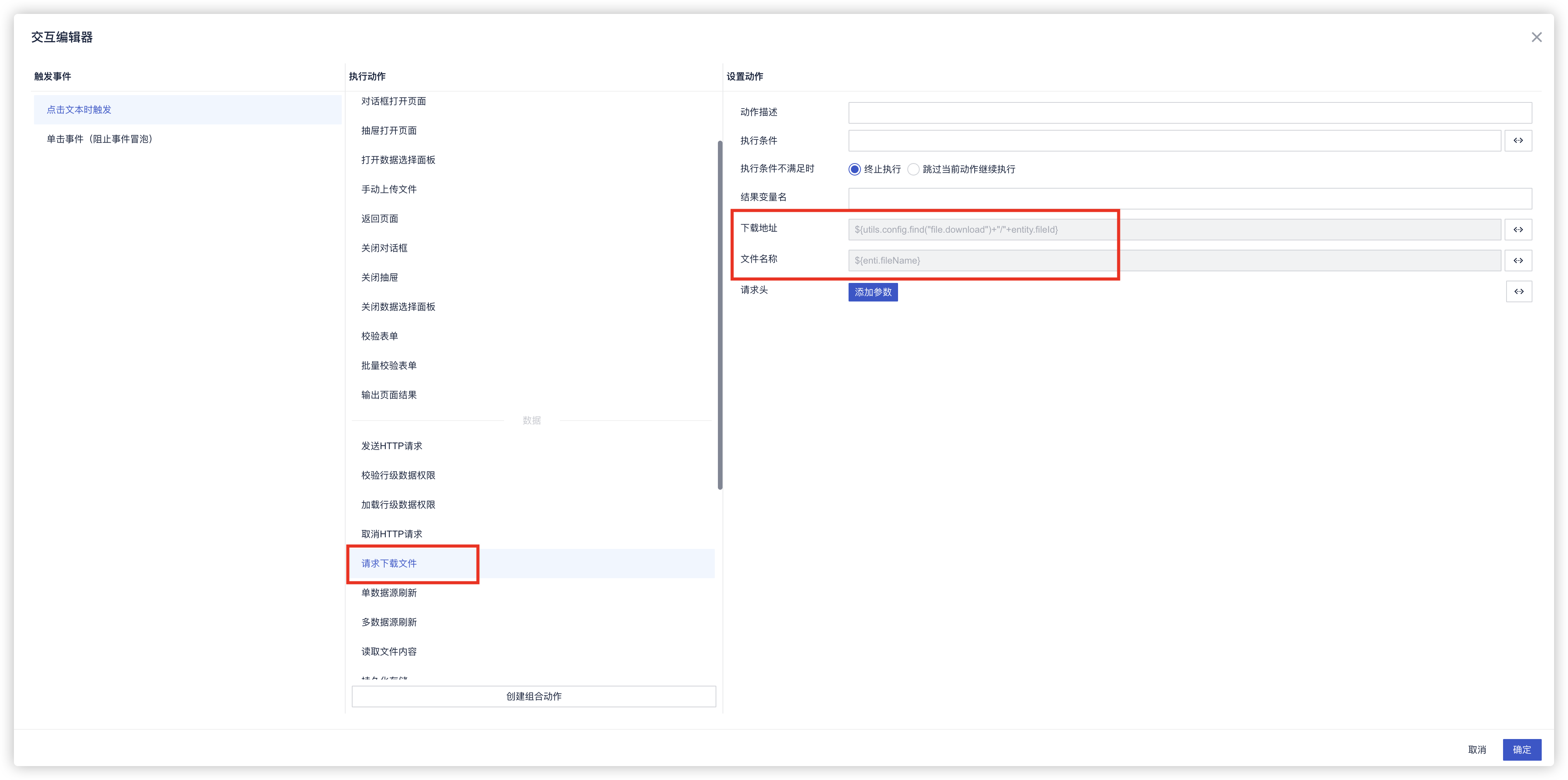 utils.config.find("file.download")+"/"+entity.fileId,下载地址是系统下载接口地址+文件上传成功返回的fileId,上图样例的entity.fileId演示的是使用前例存入业务数据对象里的fileId - 文件名称:可以自定义下载成功的文件的文件名,上图样例的entity.fileName演示的是使用前例存入业务数据对象里的文件名
