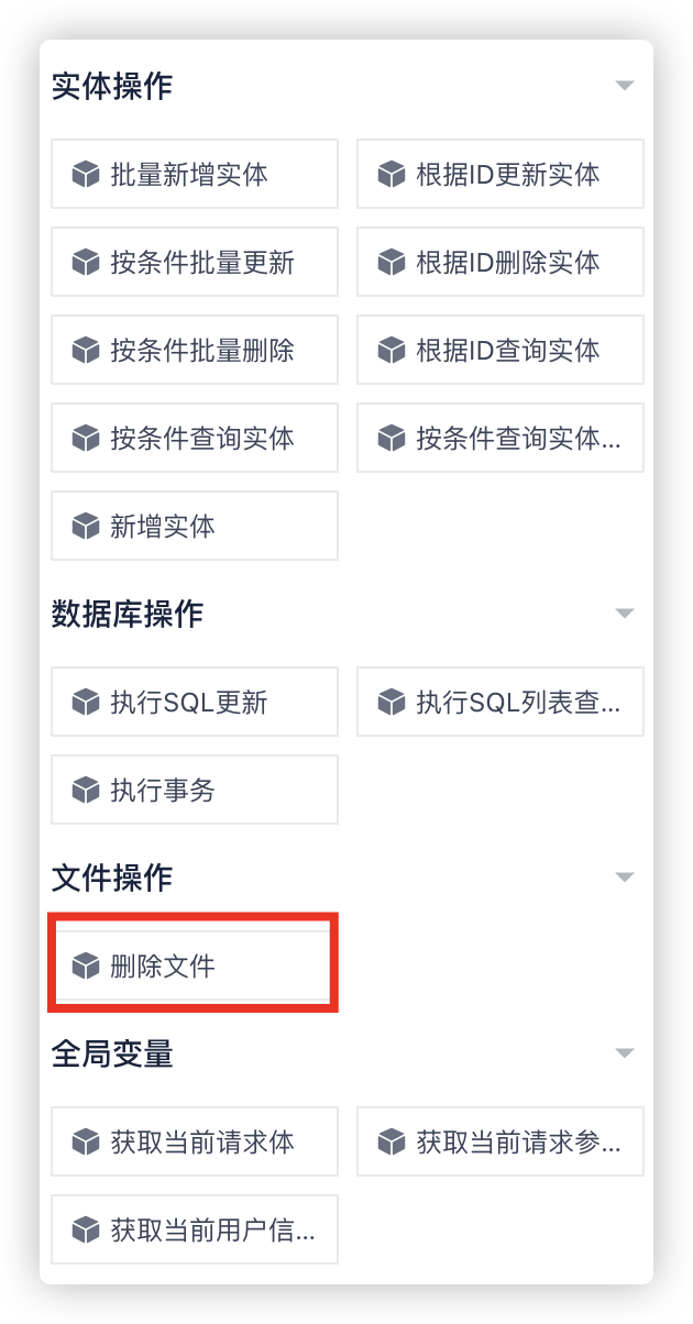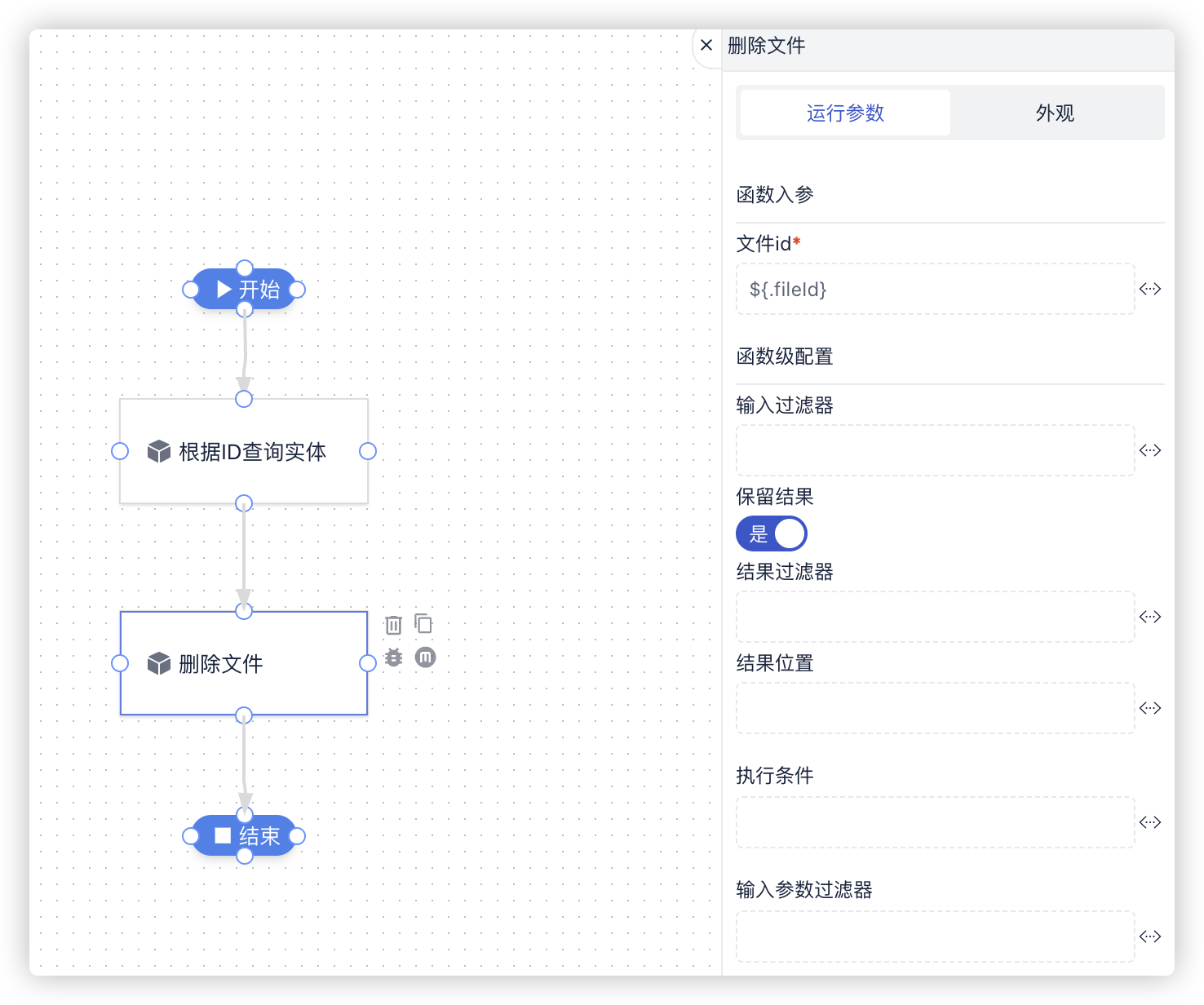 引入文件模块之后,编排设计页会提供删除文件节点,下面介绍其中一种常见的使用场景。