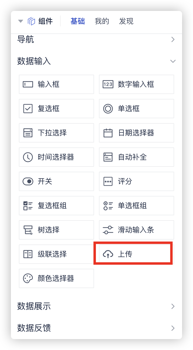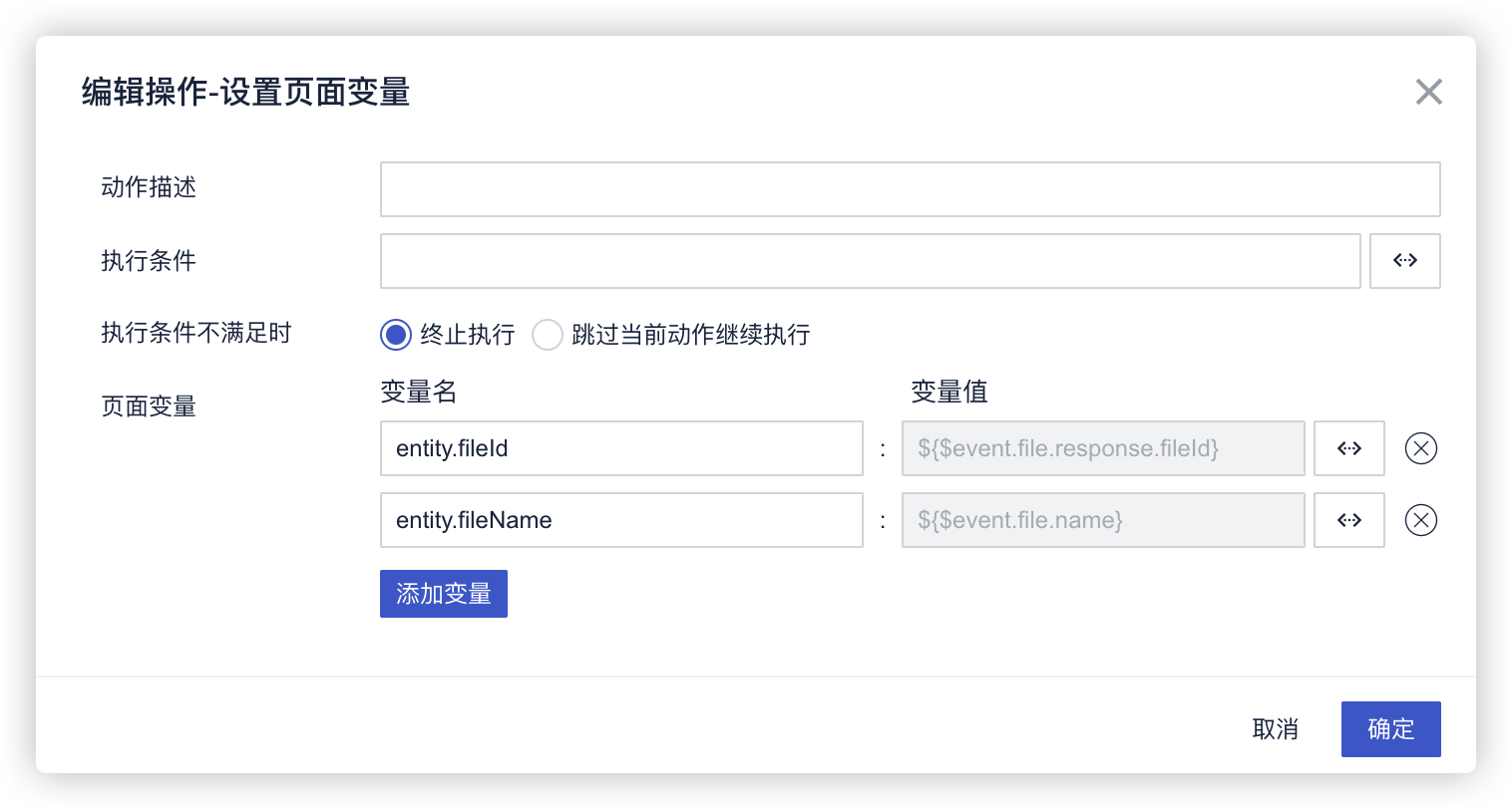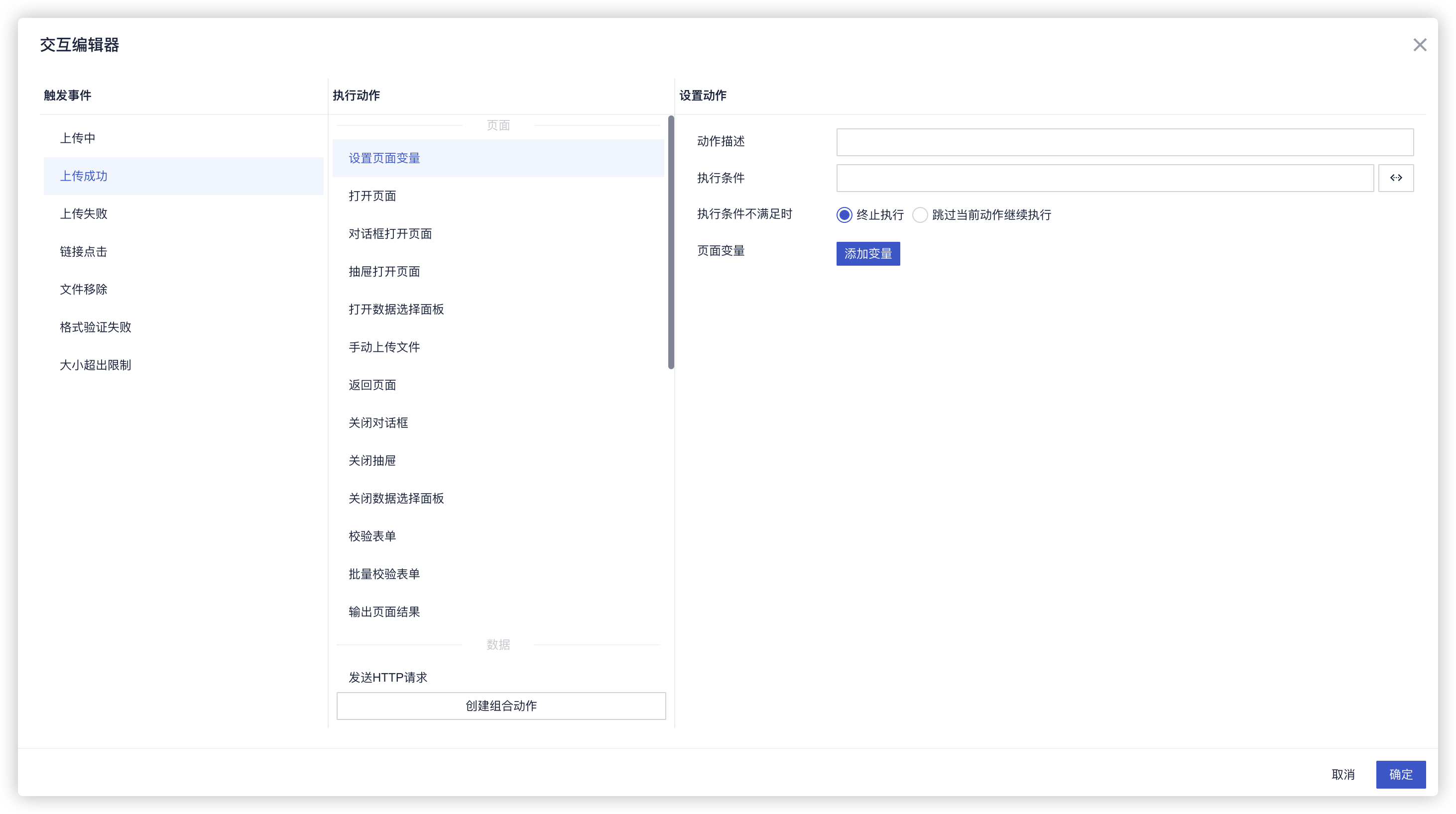 为上传控件添加交互,获取上传成功事件的参数,这部分数据包含文件基础信息和上传文件成功后返回的fileId(下载文件需要用到这个fileId),可以通过设置页面变量的方式按需将这些数据存入业务数据对象里,下图演示了将文件fileId和文件名存入业务对象的fileId和fileName字段。