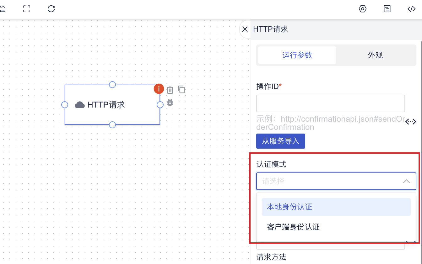 编排中,如 HTTP 请求节点里可以看到有认证模式的选项,我们现在默认提供的认证模式有两种,分别是【本地身份认证】和【客户端身份认证】: