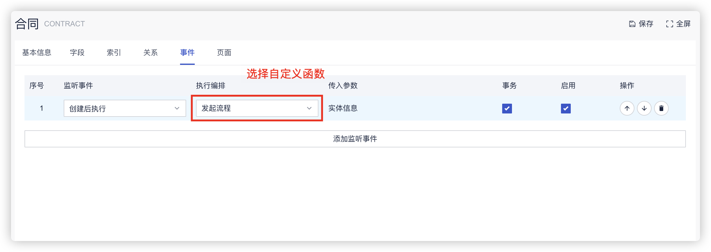 在【实体】中选择一个实体,进入【事件】设置实体的创建/更新/删除等操作的前后事件函数: