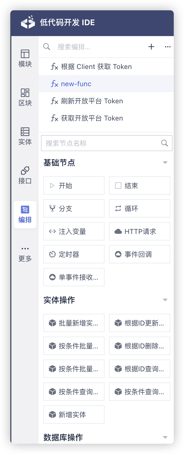 低代码平台整合了开源引擎Serverless Workflow (opens new window) 实现后端业务逻辑的编排,以前通过 java 代码来实现业务逻辑,现在可以通过可视化编排的方式进行,通过将大程序分割成一系列小步骤的函数操作,实现逻辑的自由组装。每个函数负责简单的功能,平台内置了基础节点,实体操作,数据库操作,流程操作等常用节点。同时,允许开发人员扩展函数逻辑节点。