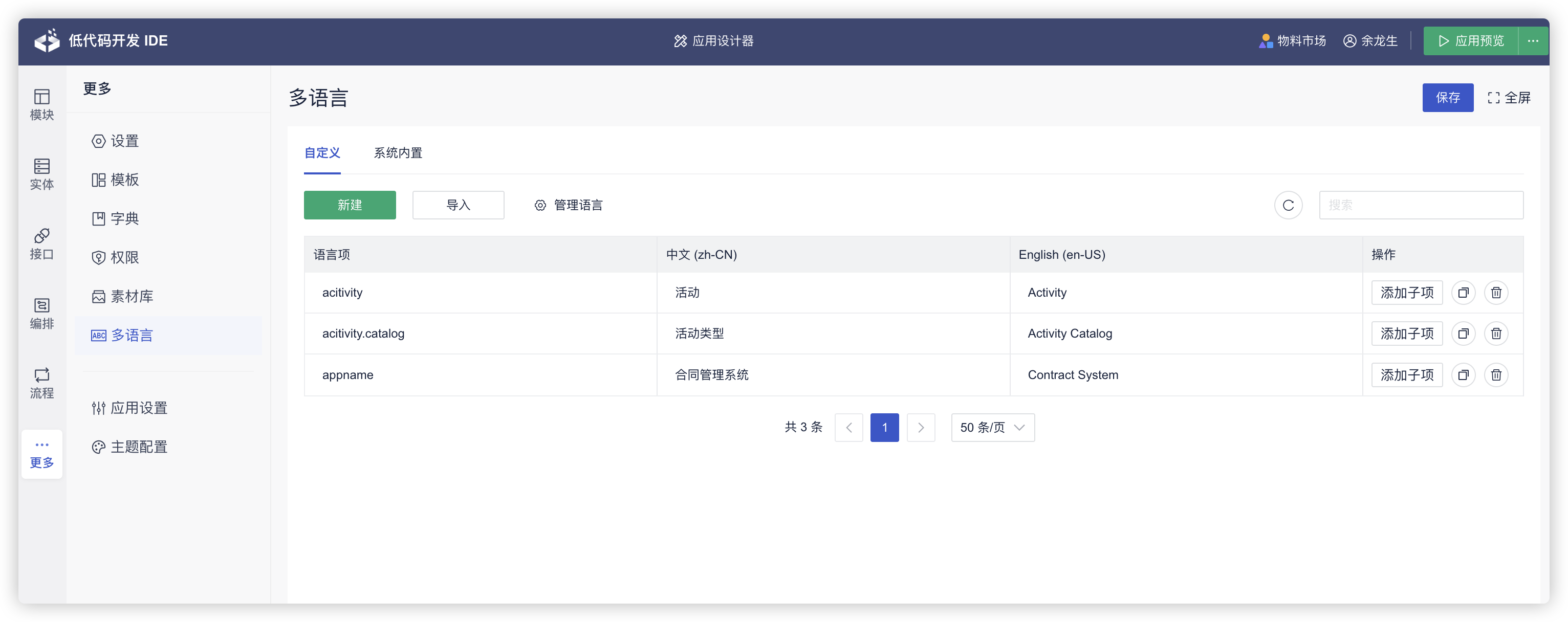 进入IDE后,在更多>多语言中,可以看到多语言的配置。包括自定义的和系统内置的,其中业务侧需要配置的语言项,需要在自定义中进行配置。默认会包含两种语言:中文(zh-CN) 和 English(en-US),需要支持更多语言类型可以在管理语言增加。