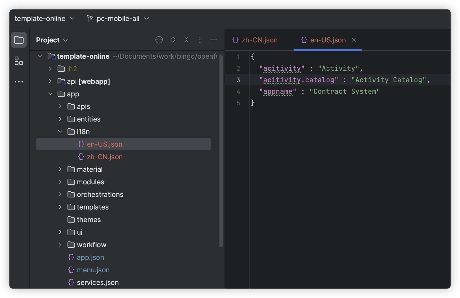 保存后,我们可以在工程的 app/i18n 目录下看到这些语言包文件,开发者也可以直接编辑 json 文件。