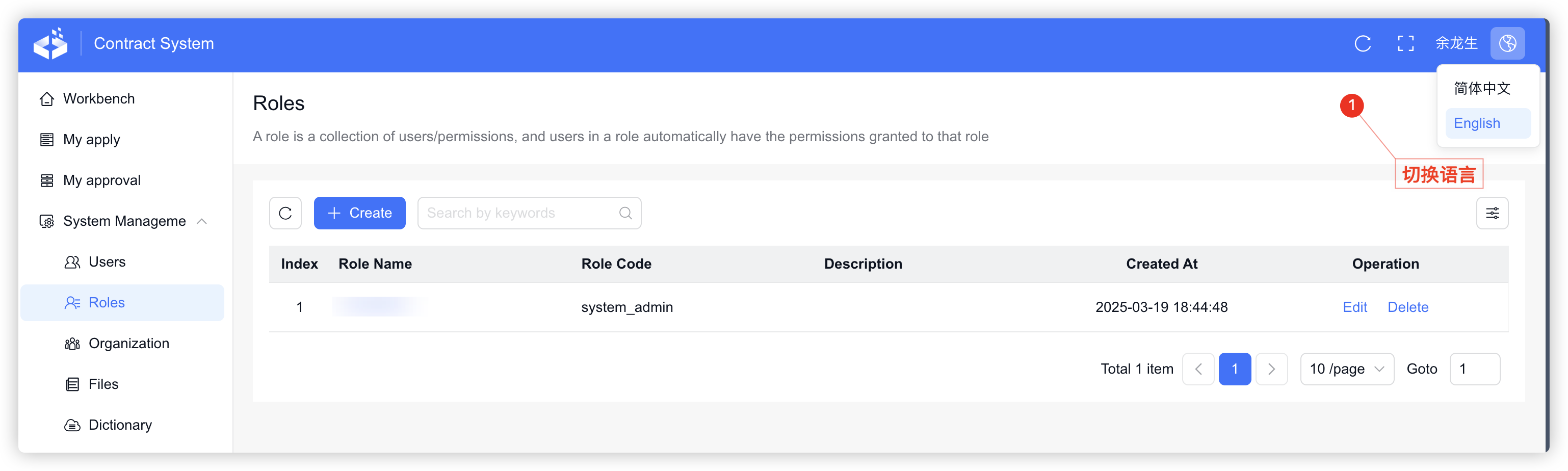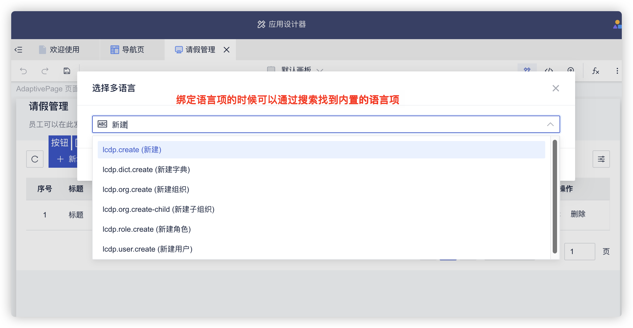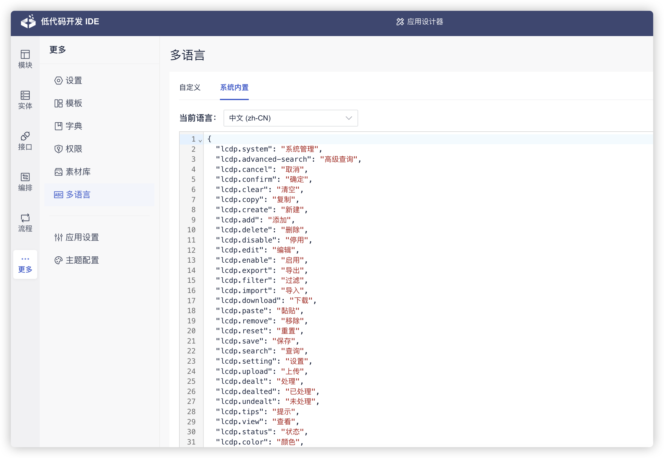 平台内置了一套语言包,以 lcdp 作为开头的语言项,在业务侧也是可以直接使用的,这些语言项可以在系统内置中查看。对于平台内置的管理功能:用户管理、组织管理、角色管理、数据字典等功能,已经全面进行的多语言支持。