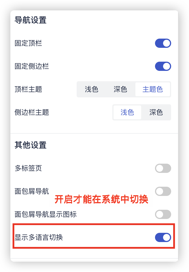 要在业务系统中能够让用户能切换多语言,需要先把显示多语言切换打开。