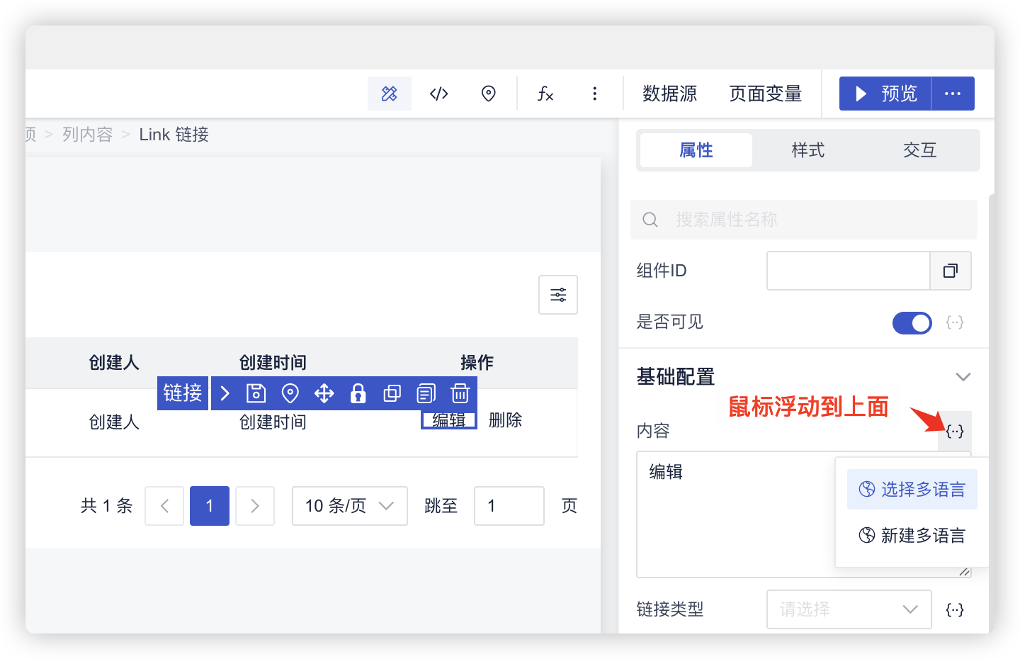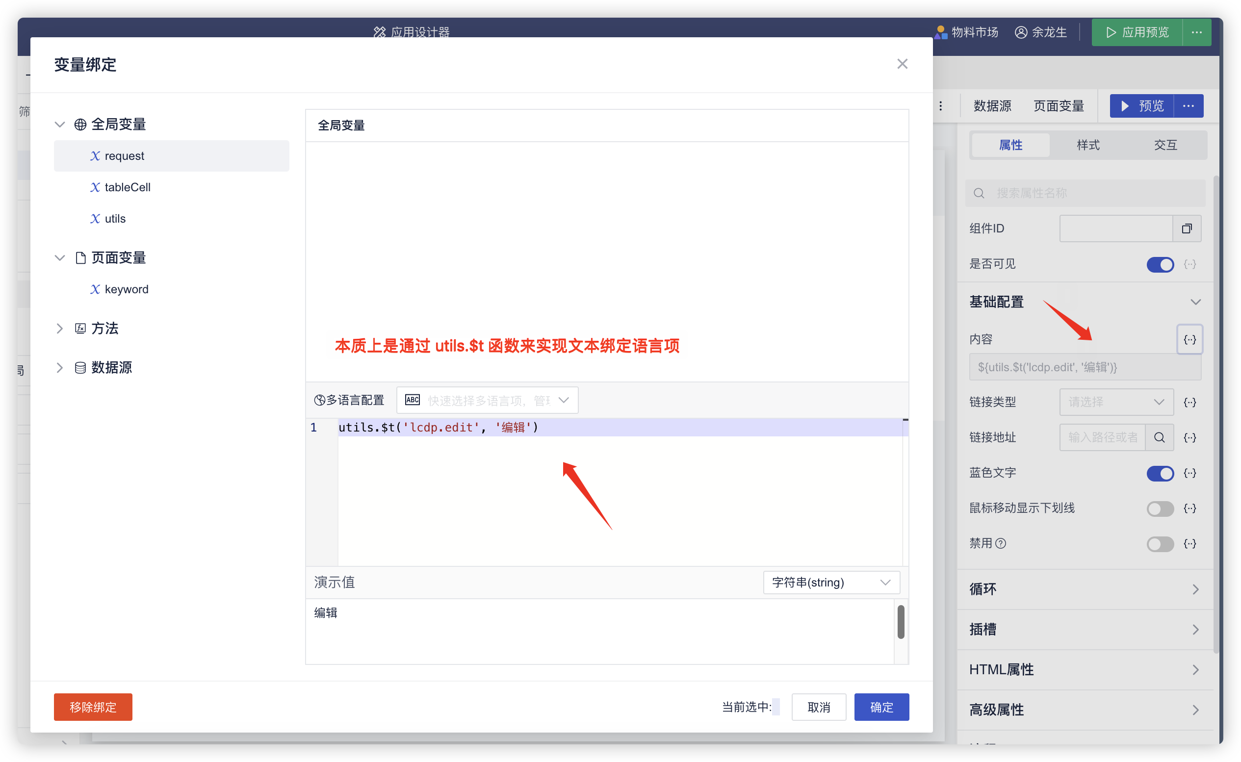 页面任何元素都可以绑定语言项,以复杂表格组件里面的 编辑 按钮为例。在绑定表达式的 {} 按钮上可以选择语言项和新建语言项。