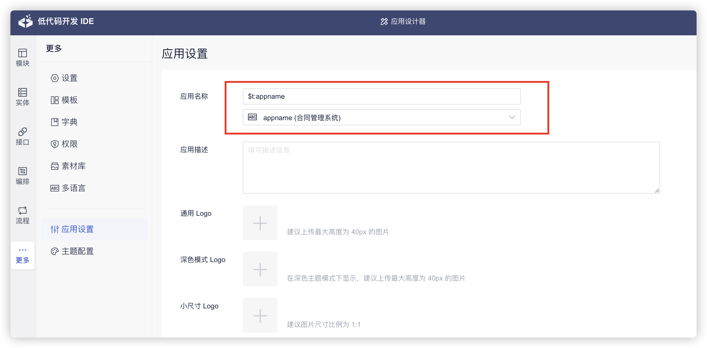需要在多语言中设置一个语言项,例如: appname ,之后在应用设置中绑定语言项。