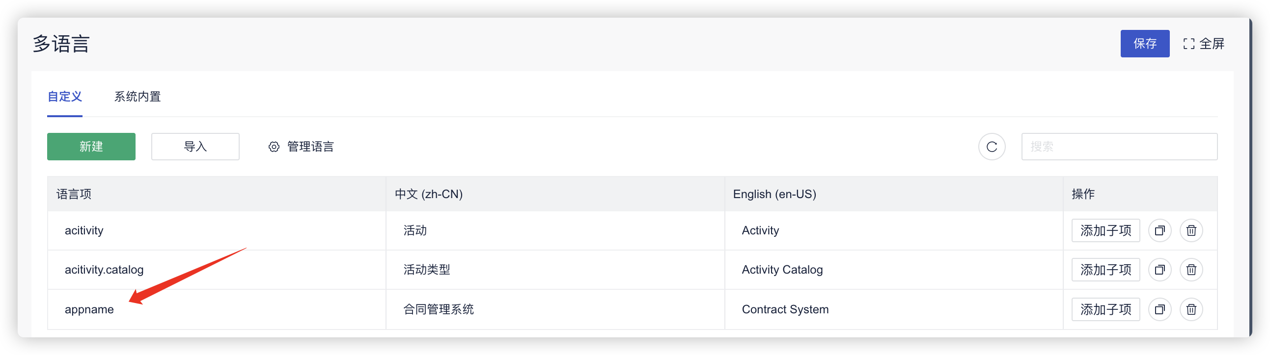 在【管理语言】中,增加一个语言包,命名为 zh-CN-A,并在 event 语言项中增加一个值 事件。底层会自动合并多个语言包的值,最终在系统中显示为 “事件”。 zh-CN-** 的都会合并在一起,在部署的时候,仅仅需要在 application.yml 中设置。