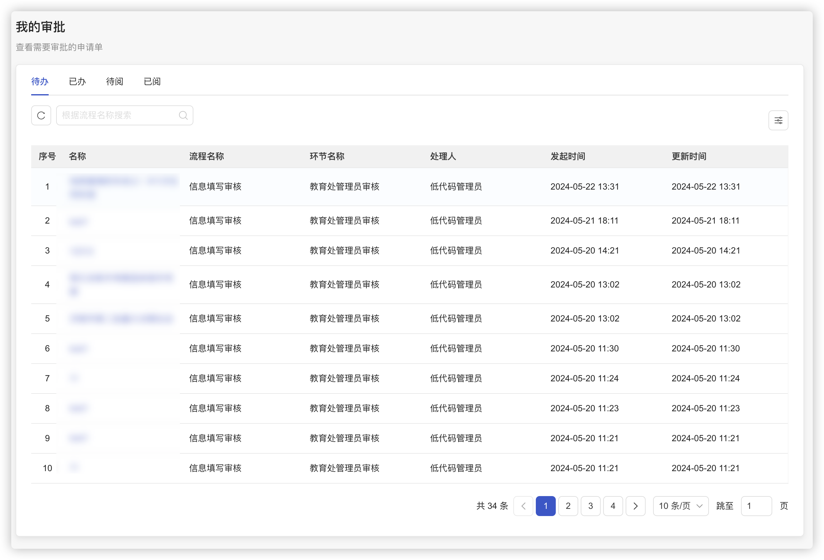 低代码提供了流程管理相关功能页面,包括我的申请,我的审批,表单详情,审批历史等。
