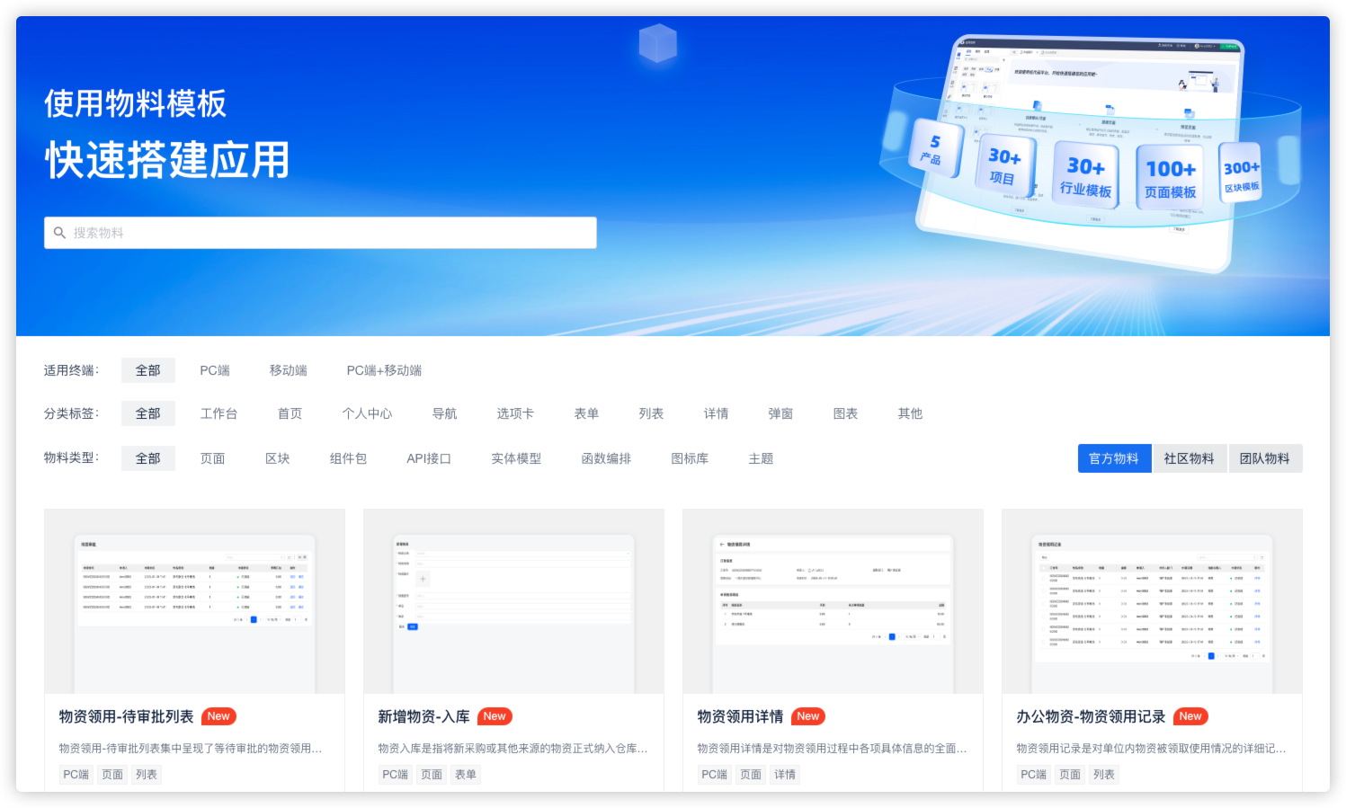 物料市场提供的物料,主要包括页面、组件和区块三种类型。随着平台的发展,会推出更多类型的物料,以满足不同开发需求。