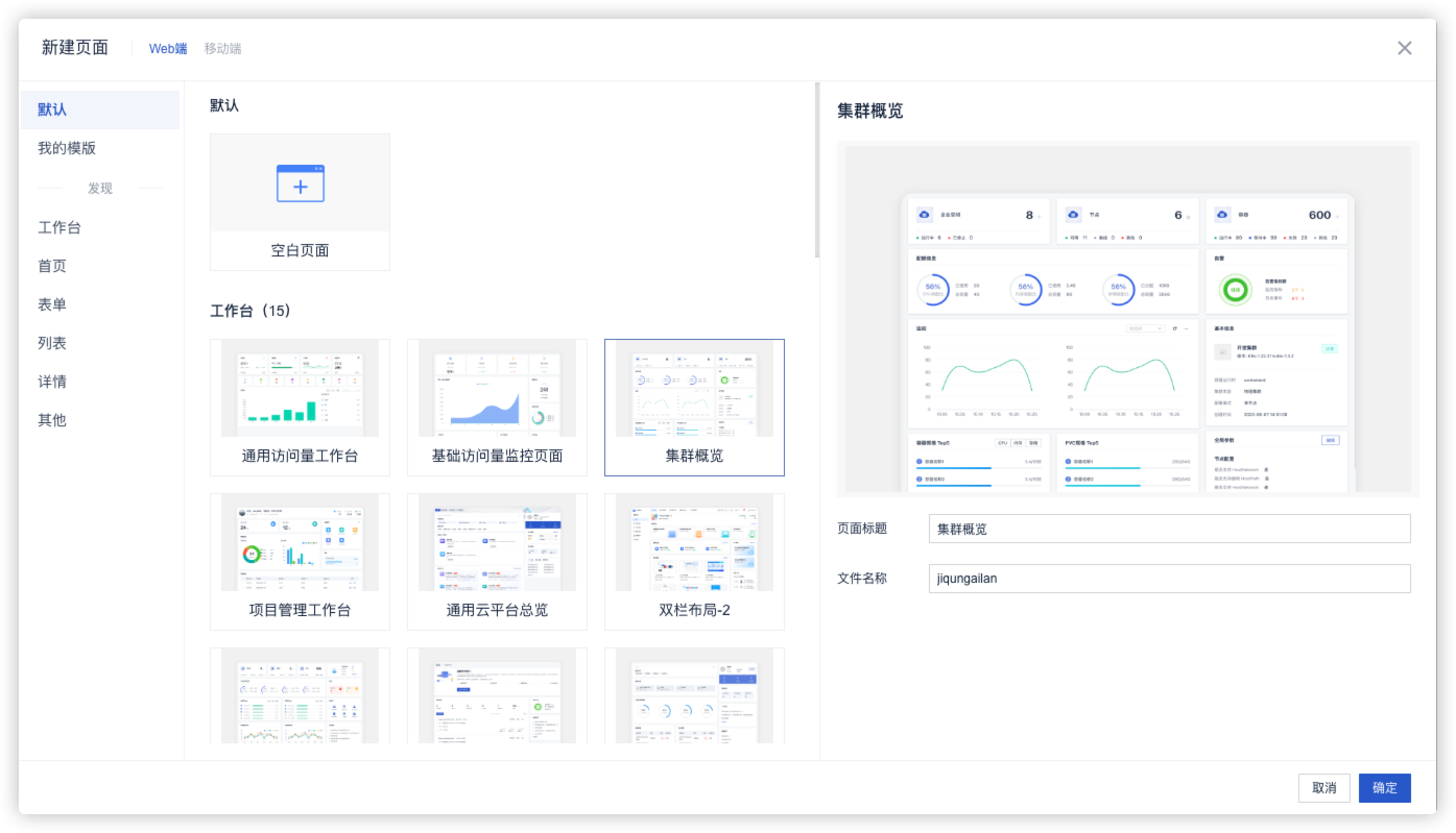 在新建页面时,可以选择使用物料新建页面,选择物料后,可以预览物料的效果,确认后即可新建页面。