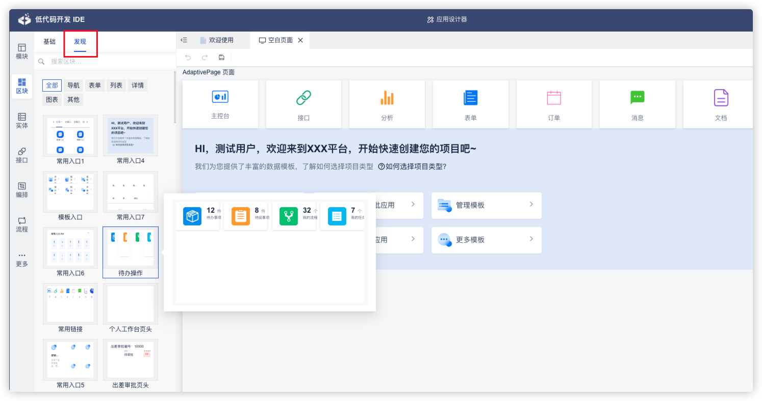 打开某个页面,在区块 => 发现里面,找到合适的区块,拖拽到页面中即可使用。