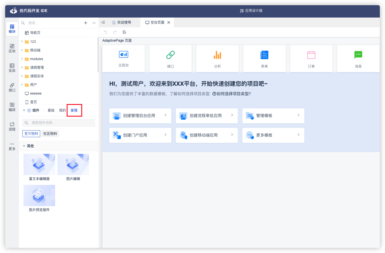 在低代码开发IDE中,有多个入口可以使用物料。以下介绍几个常用的入口:
