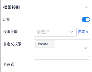 - 【权限关联】下拉选择+【自定义权限】回车配置:都是配置多个明确命名的权限,若所有权限都存在于