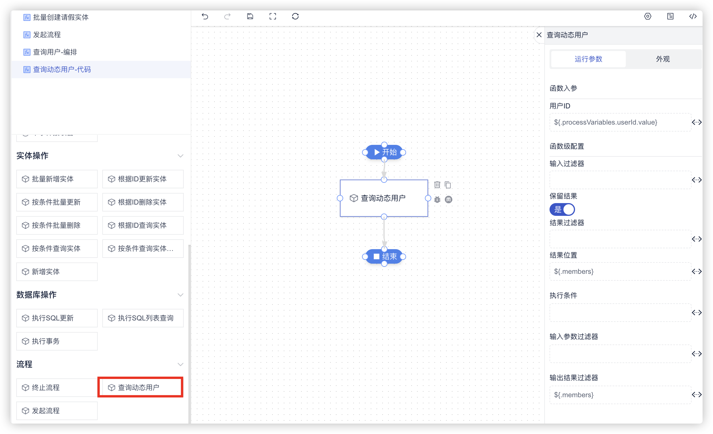 需要注意的是,在查询动态用户的编排中,需要配置结果位置、输出结果过滤器,目的是为了排除中间过程参数,保证最终返回的结果是一个包含用户ID的数组。