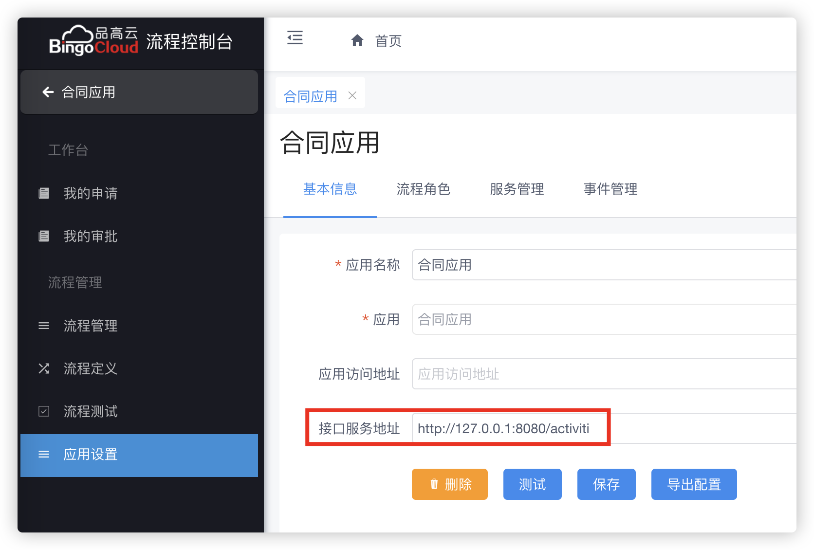 为了让流程服务能够调用业务应用的动态参与者接口,首先需要将业务应用的服务地址注册到流程服务的应用设置中。