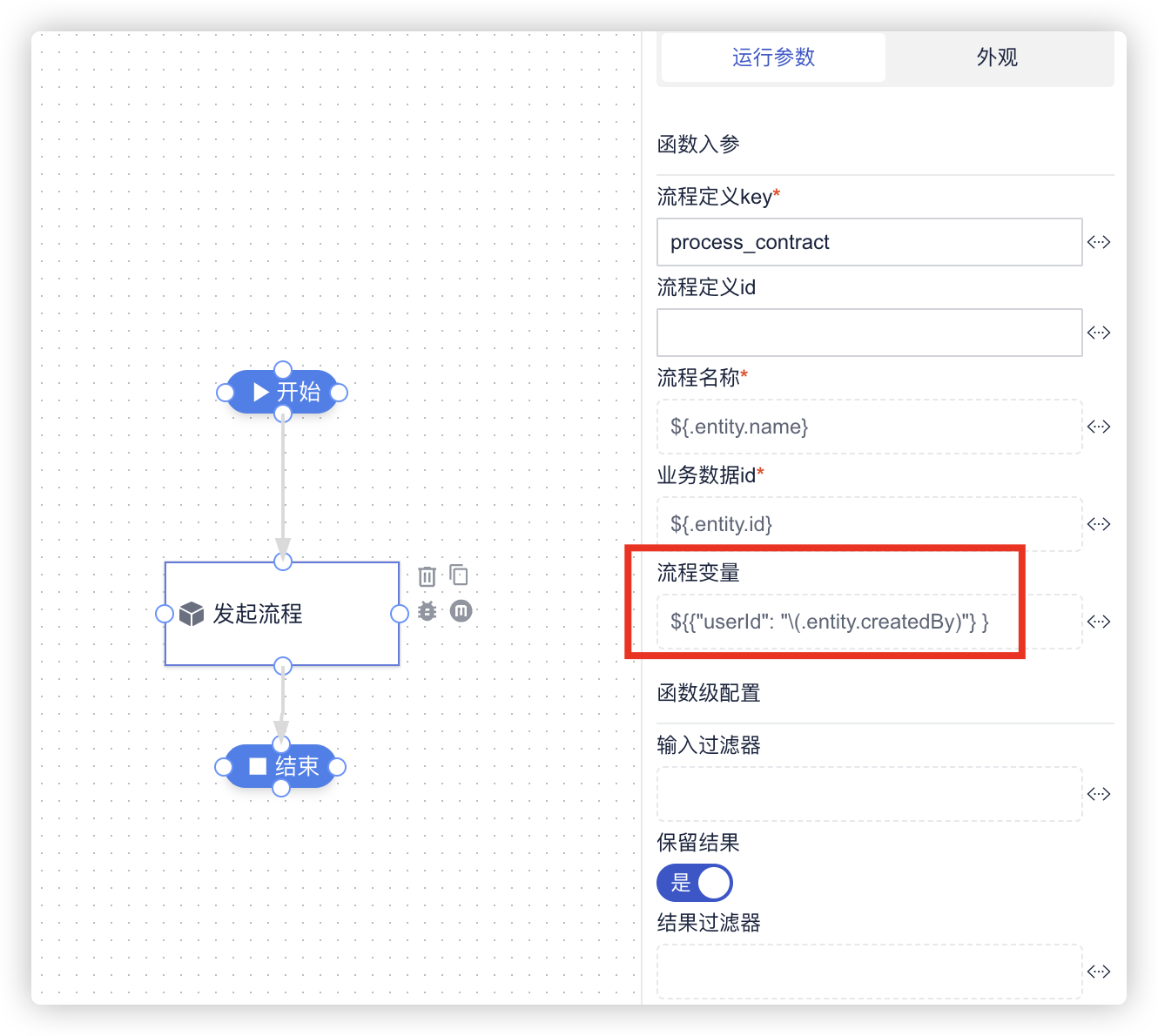 在编排函数中可以使用上下文参数,例如上图通过.processVariables.userId.value获取了前文设置的流程变量。
