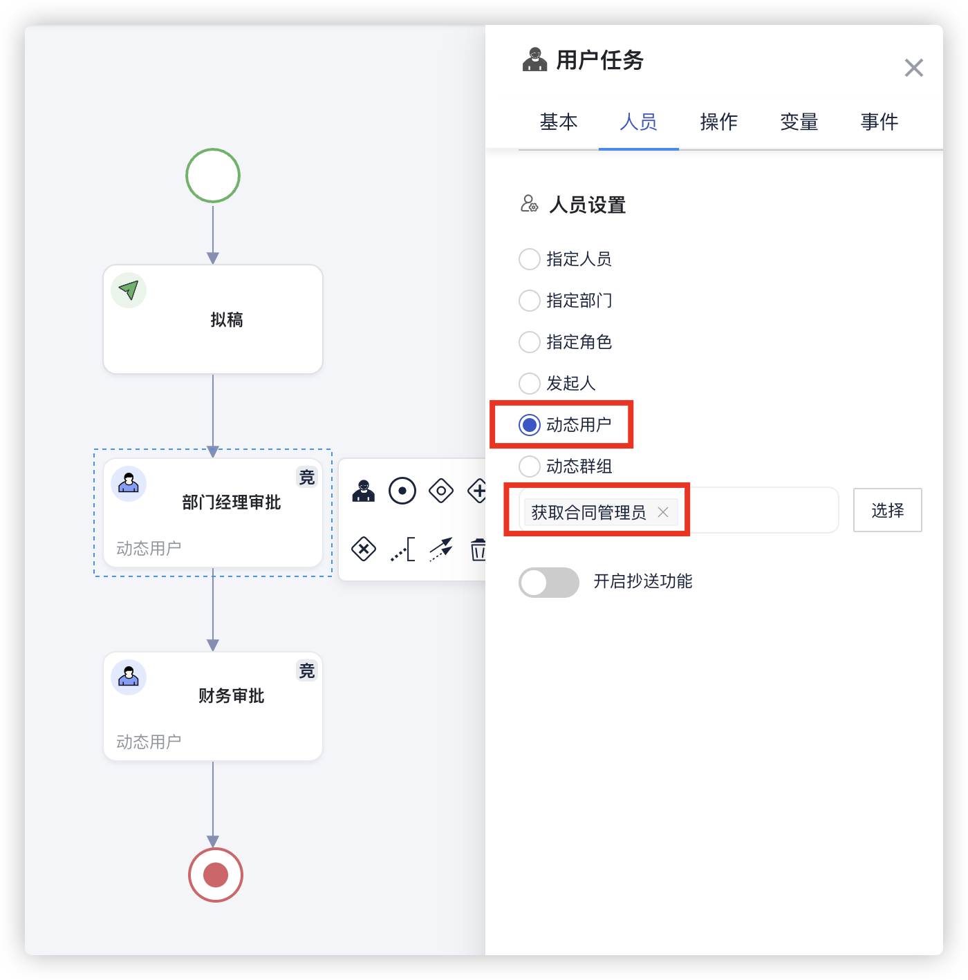 基于编排的动态参与者,可以在流程运行时动态指定参与者,包括用户、角色和部门。
