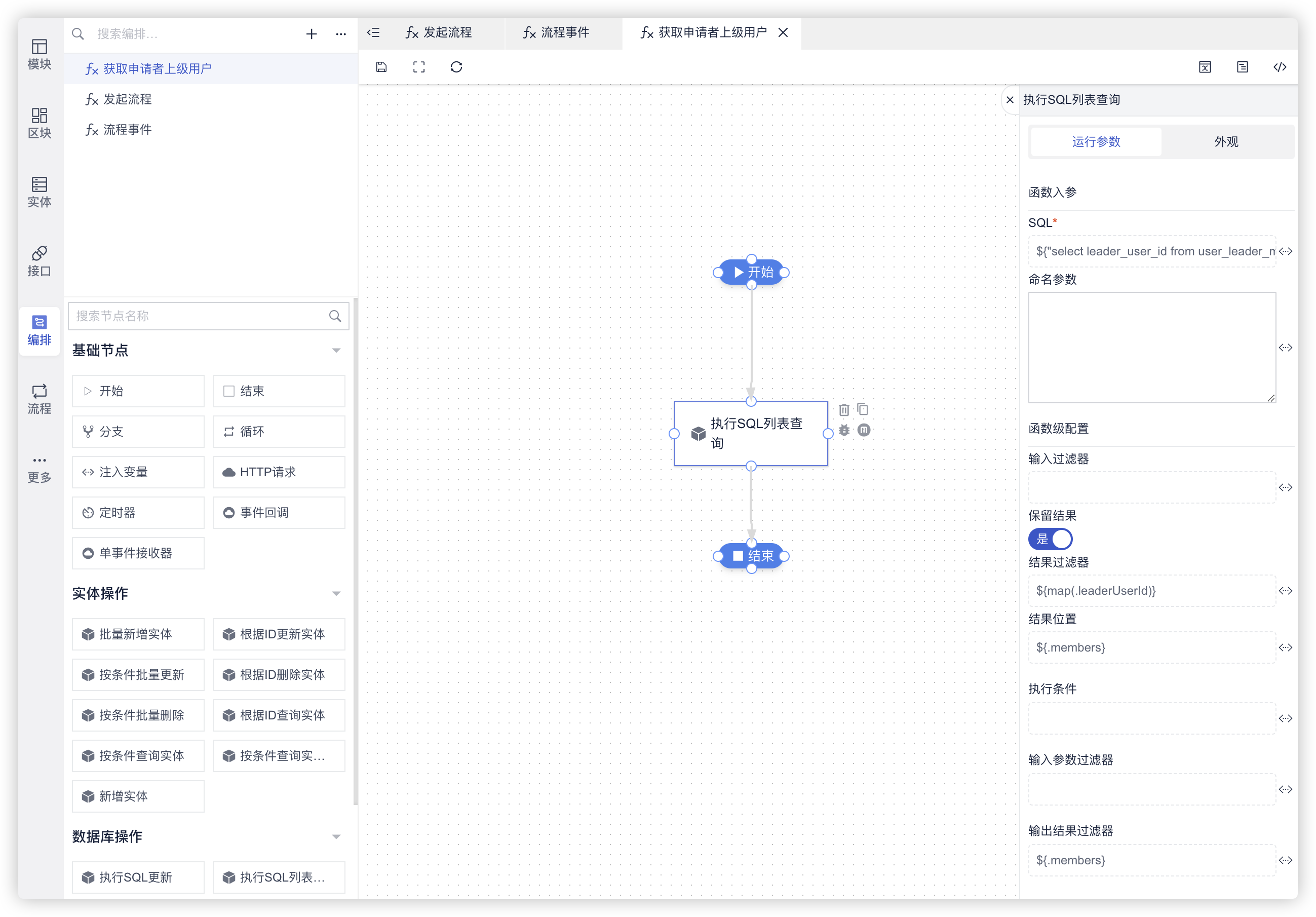 示例中,我们是通过执行SQL列表查询节点来获取申请者上级用户: