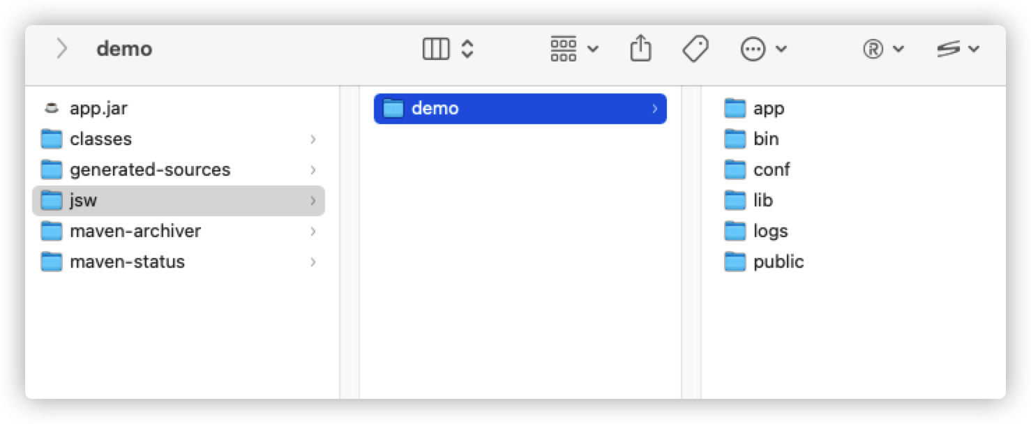 进入到 api/target/jsw/demo 目录,以在 mac或者linux 为例(windows 执行对应的 *.bat 脚本)。